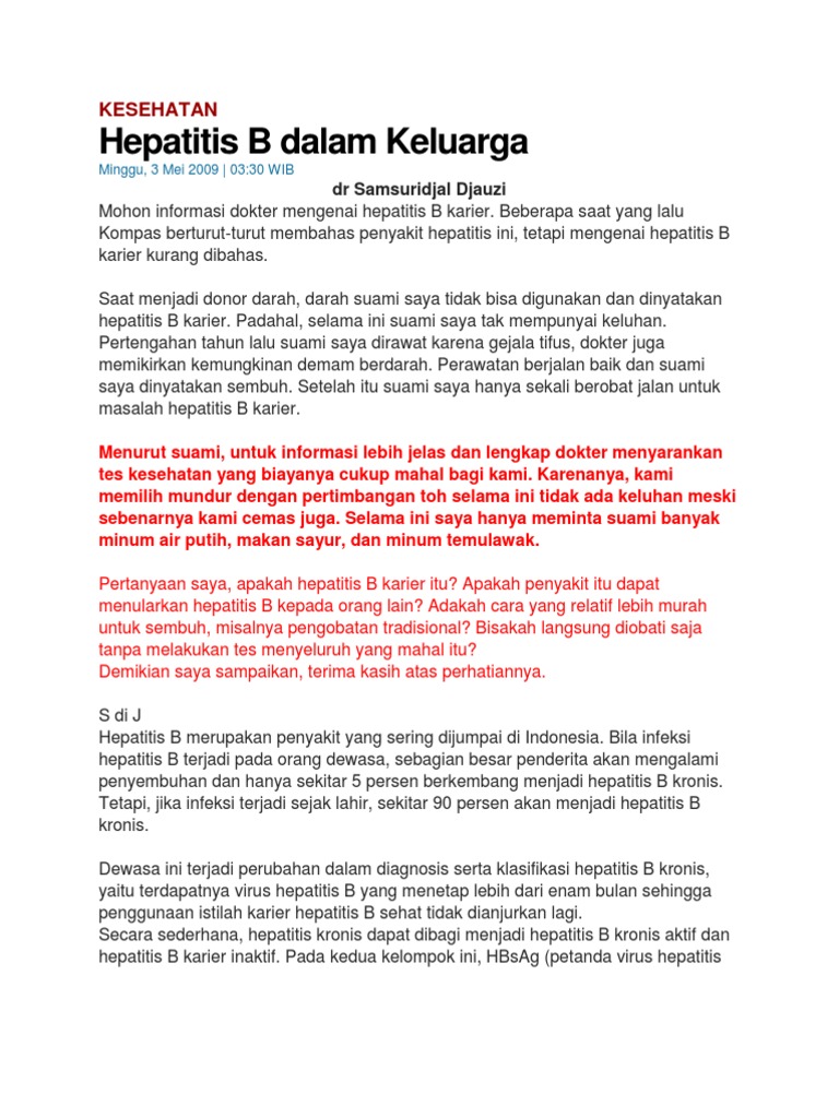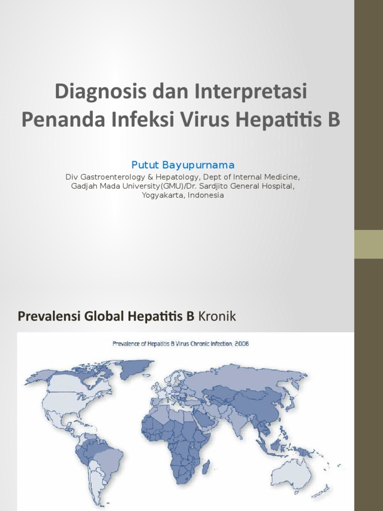 Hepatitis B atau infeksi hati adalah infeksi virus hepatitis B VHB pada hati. Keadaan ini jelas membahayakan karena anak-anak bisa terlihat sehat padahal di dalam tubuhnya mengandung virus hepatitis B yang akan berjalan progresif menahun dan menjadi kronis ketika mereka dewasa. Relation to type of therapy and pre-treatment serum hepatitis B virus DNA and alanine aminotransferase.